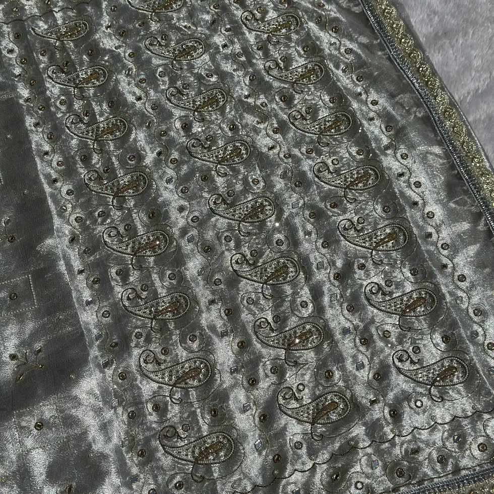 The Chandani Silver Banarasi Tissue Saree by RV COUTURE 24 is a serene expression of grace and timeless beauty. Crafted from pure Banarasi tissue fabric, this saree features a soft luminous sheen and a feather-light texture that drapes effortlessly, creating an ethereal and refined silhouette.