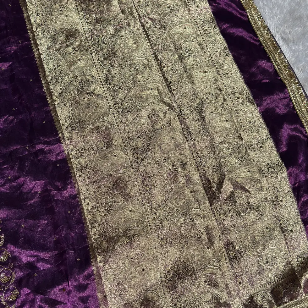 The Mohini Purple Banarasi Tissue Saree by RV COUTURE 24 is a graceful embodiment of charm and timeless elegance. Crafted from pure Banarasi tissue fabric, this saree features a soft luminous sheen and a feather-light texture that drapes beautifully, enhancing its refined and sophisticated appeal.