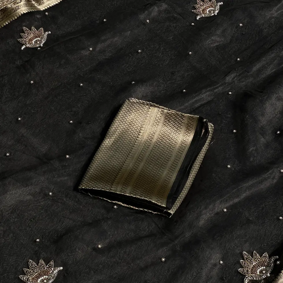 The Raat Rani Black Banarasi Tissue Saree by RV COUTURE 24 is a captivating blend of timeless elegance and refined luxury. Crafted from pure Banarasi tissue fabric, this saree showcases a delicate sheen and lightweight texture that drapes gracefully, creating an effortlessly sophisticated silhouette.